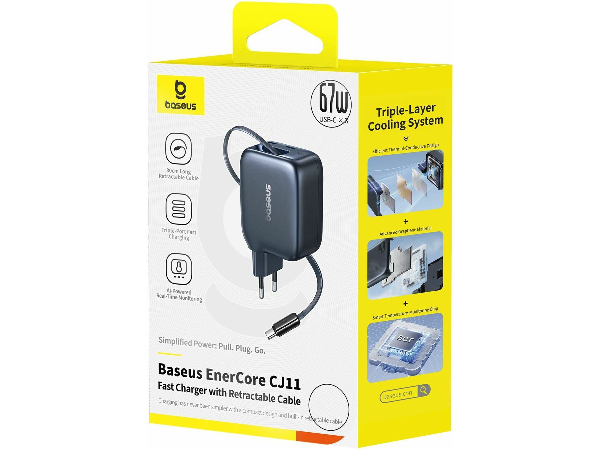 BASEUS бързо зарядно 220V 67W, 2хUSB-C + вграден кабел Type-C, GaN6