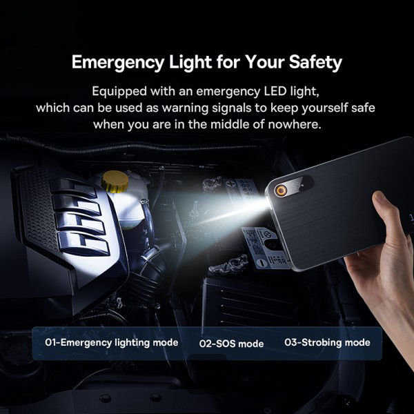BASEUS Super Energy Pro разполага с вградена LED светлина, която е изключително полезна при нощни аварии, лоша видимост или работа около автомобила. Това повишава безопасността и удобството при реални пътни ситуации.