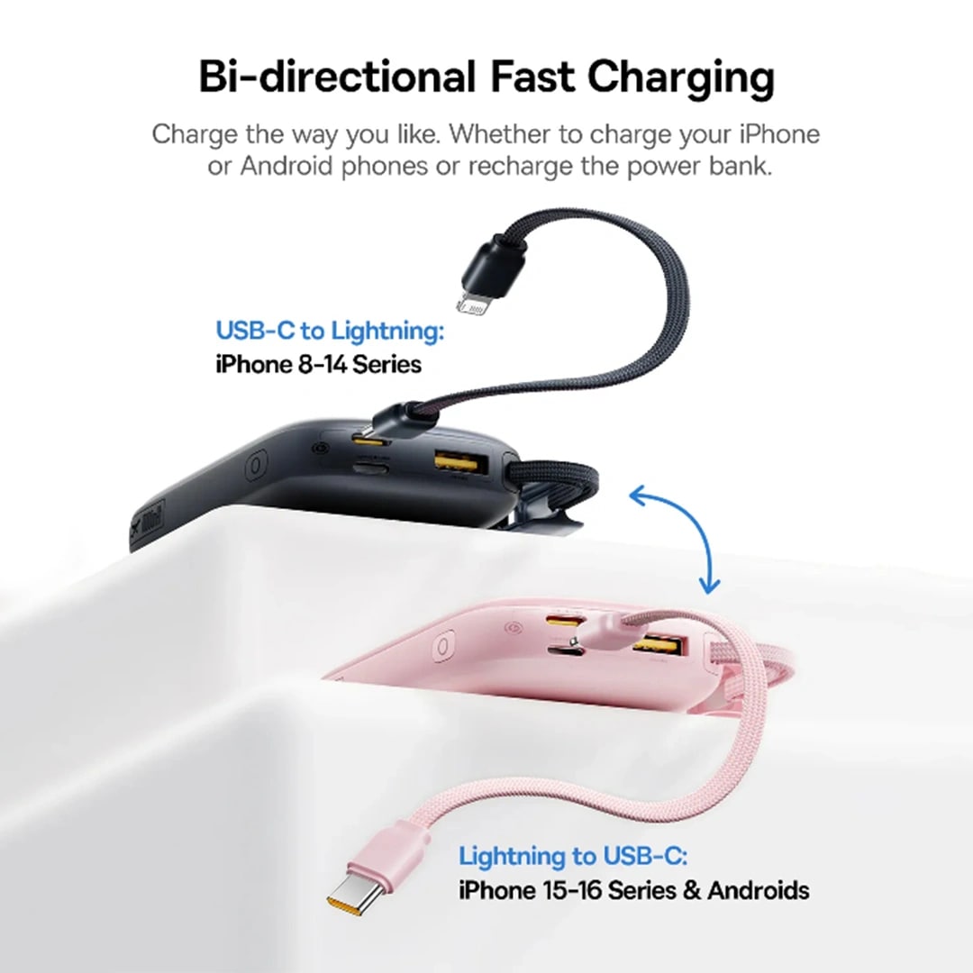Благодарение на вградените кабели USB-C и Lightning, тя осигурява максимално удобство без нужда от допълнителни аксесоари – идеално решение за пътуване, работа и ежедневна употреба.