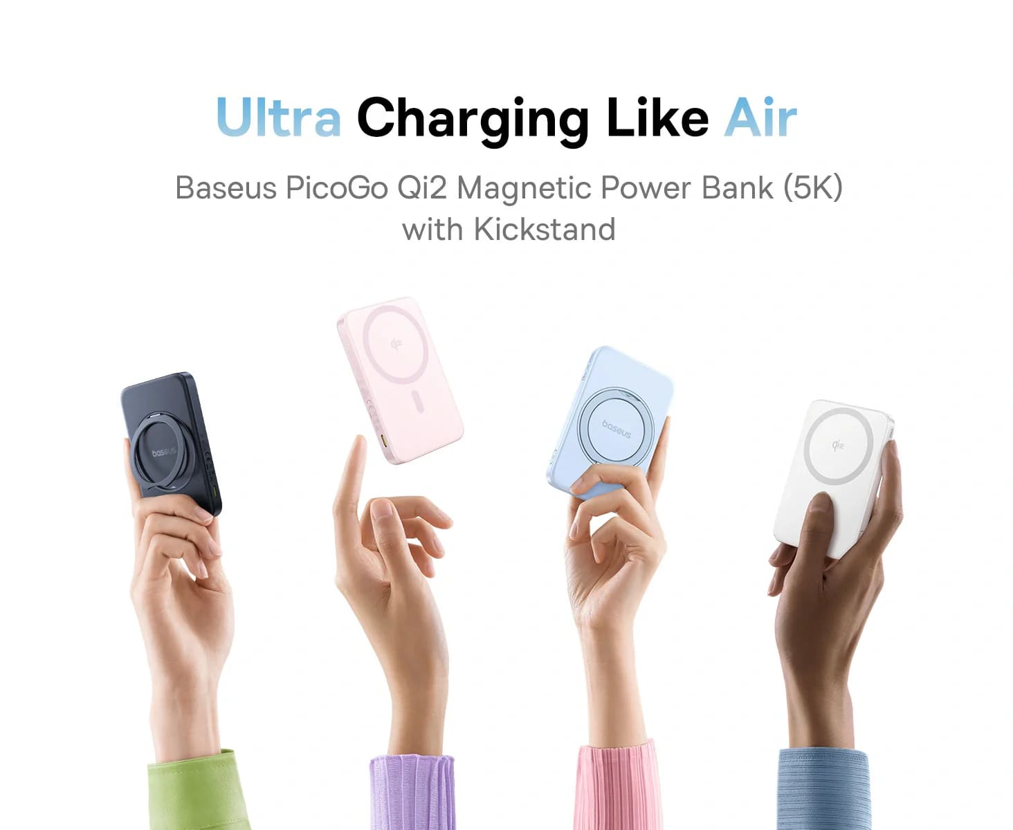 Минималистичният бял дизайн, съчетан с магнитен пръстен и вградена стойка, прави PicoGo отличен избор както за ежедневна употреба, така и за пътуване.