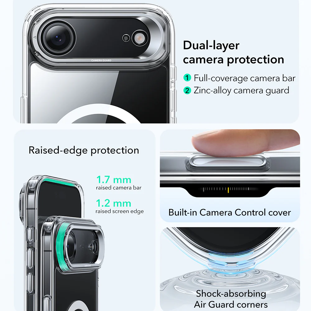 ESR Classic Hybrid разполага с технологията Air-Guard Corners, при която подсилените ъгли ефективно абсорбират силата при изпускане и неравности. Повдигнатите ръбове около дисплея предпазват екрана при поставяне с лицето надолу, а Camera Guard с повдигнат борд около камерата защитава лещите от надраскване и директен контакт с повърхности. Това превръща този калъф за iPhone 17 Air в надежден избор за ежедневна защита.