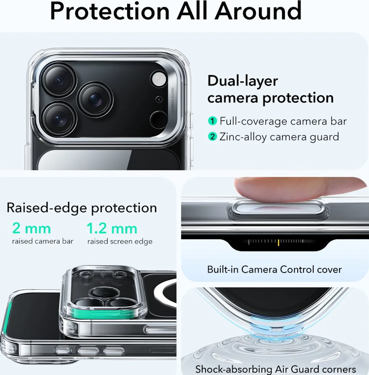 ESR Classic Hybrid разполага с технологията Air-Guard Corners, при която подсилените ъгли ефективно абсорбират силата при изпускане и неравности. Повдигнатите ръбове около дисплея предпазват екрана при поставяне с лицето надолу, а Camera Guard с повдигнат борд около камерата защитава лещите от надраскване и директен контакт с повърхности. Това превръща този калъф за iPhone 17 в надежден избор за ежедневна защита.