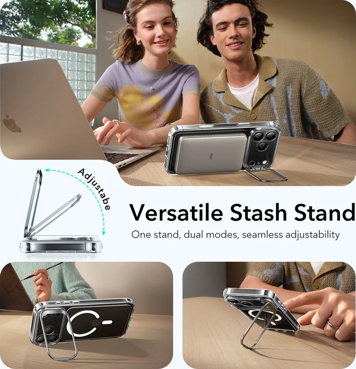 Металната рамка около камерата не само осигурява допълнителна здравина, но изпълнява и функцията на стойка за мултимедия, което позволява удобно гледане на видео или видеоразговори. В същото време калъфът предлага прецизна защита за Camera Control бутона, като запазва неговата чувствителност и удобство при използване.