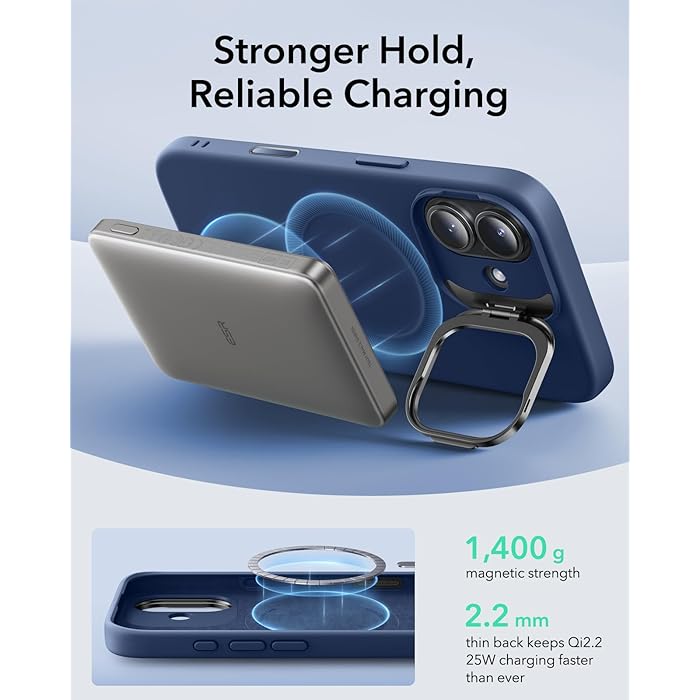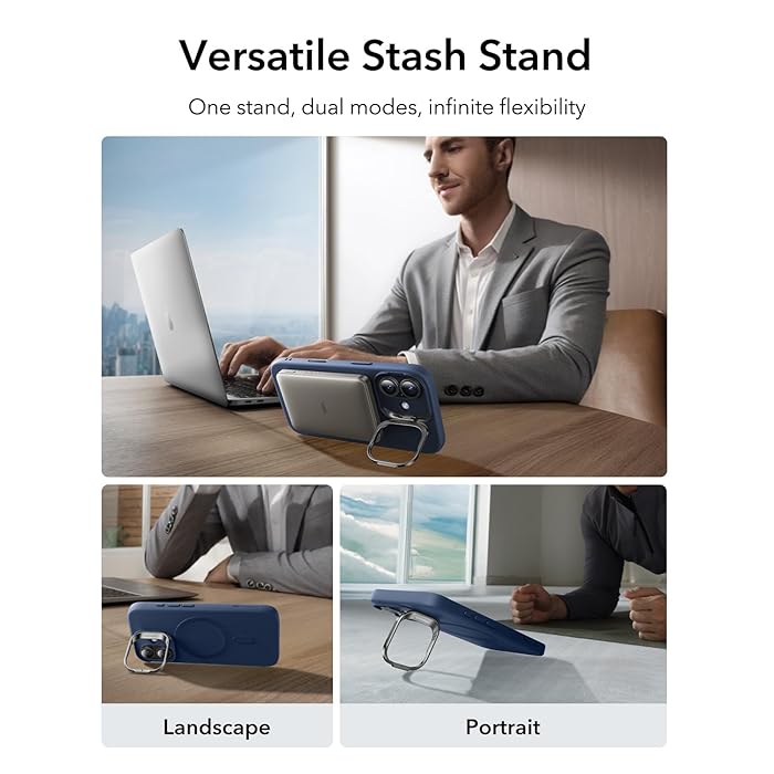 В корпуса са интегрирани мощни магнити, които осигуряват стабилно и точно подравняване с всички аксесоари в стил MagSafe. Това позволява надеждно безжично зареждане и използване на магнитни стойки и аксесоари, без да е необходимо сваляне на калъфа. Вградената стойка добавя допълнителна функционалност, като позволява удобно гледане на видео, видеоразговори или работа в hands-free режим.