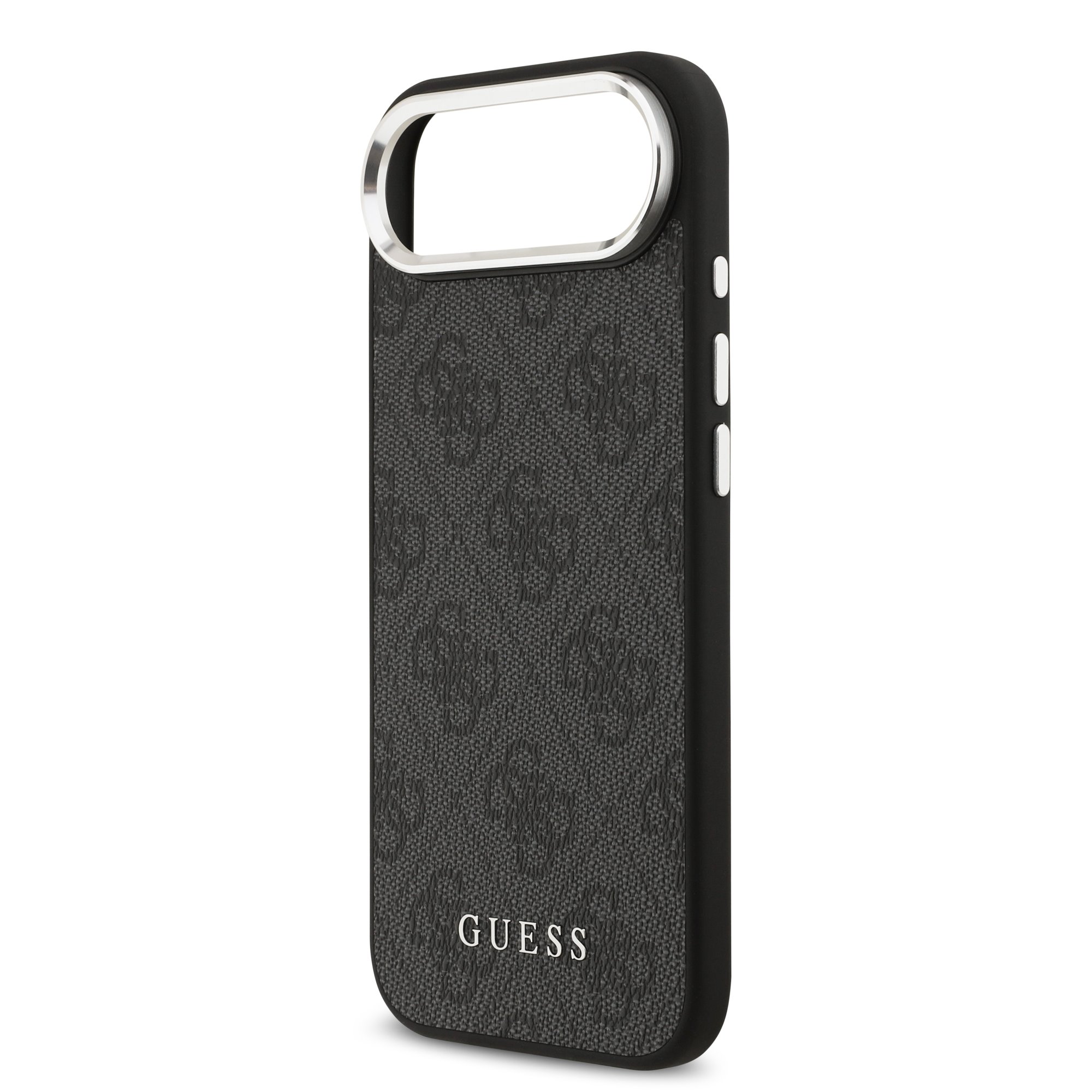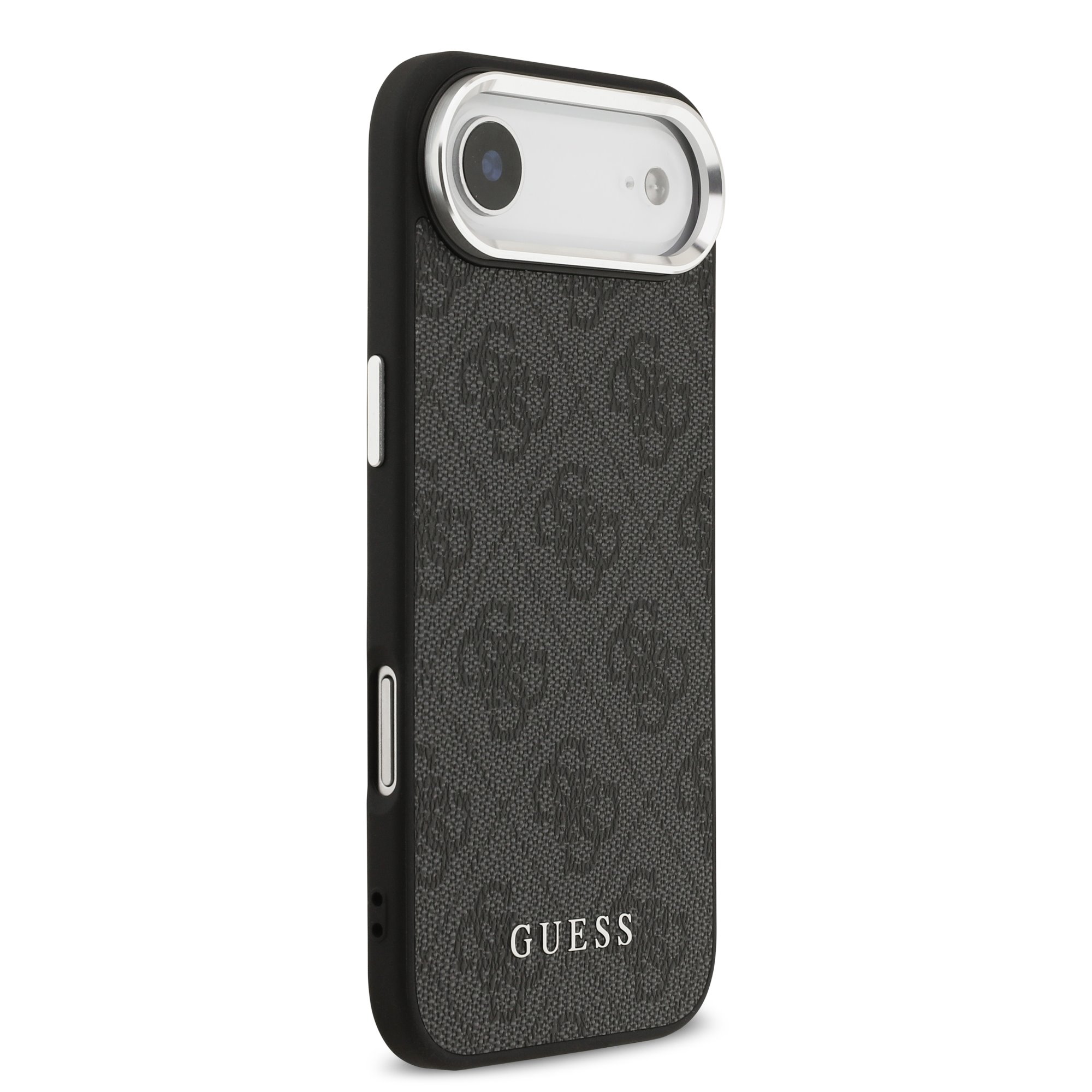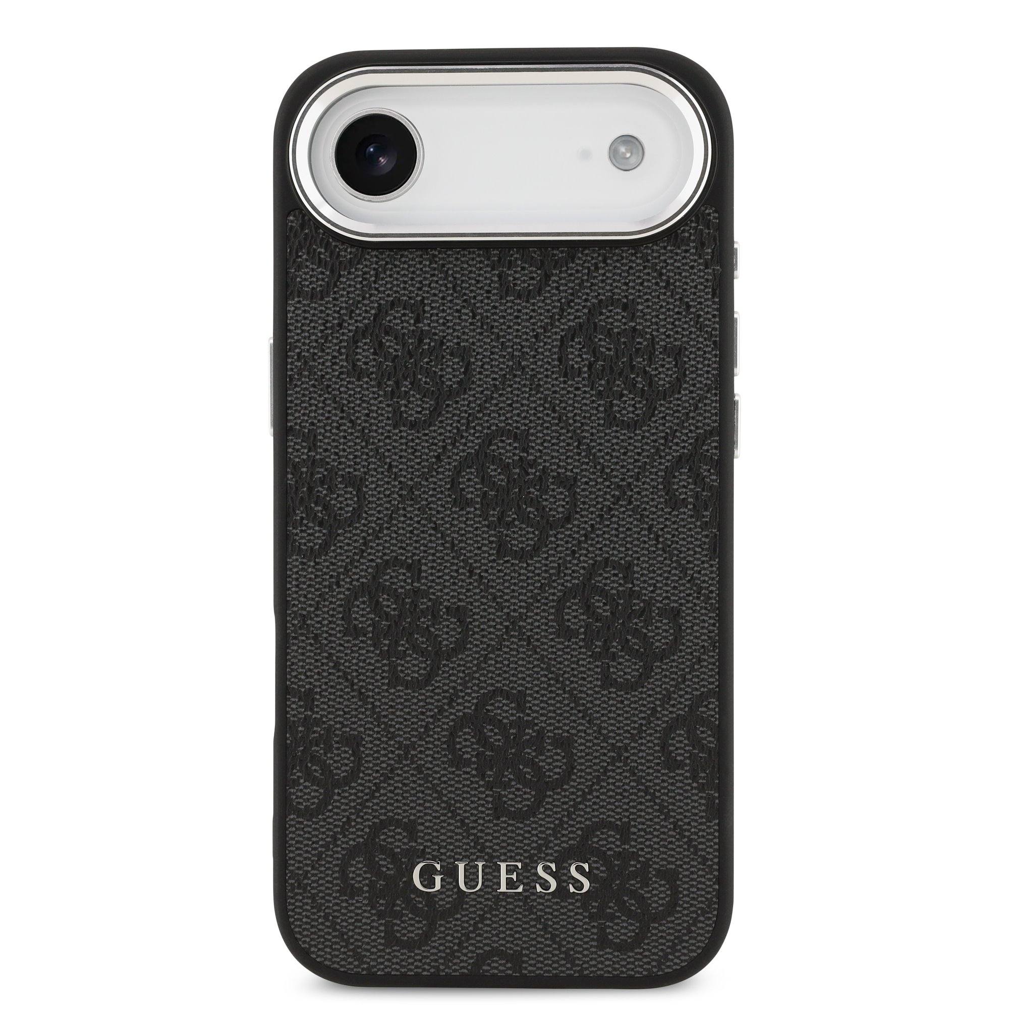 Калъфът е изпълнен в класически черен цвят, който подчертава тънкия и елегантен профил на iPhone 17 Air. Повърхността е декорирана с емблематичния GUESS 4G мотив, а дискретното лого Guess добавя фин дизайнерски акцент, без да доминира визуално.