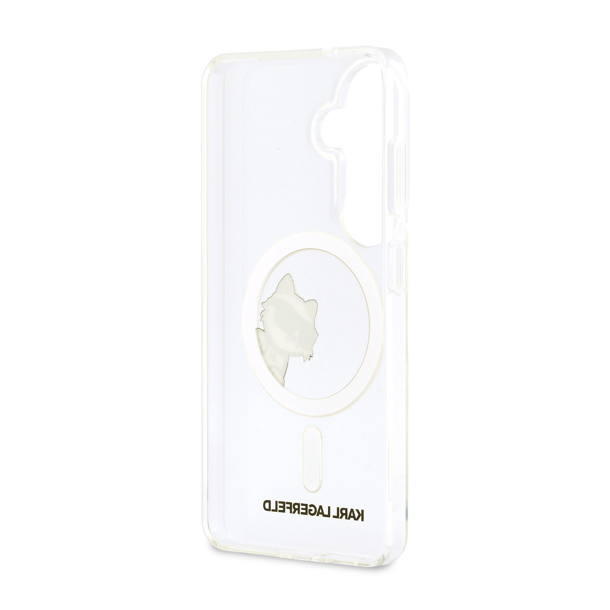 Гърбът на калъфа впечатлява с Peekaboo дизайна и мотива на надничащата котка Choupette – иконичен символ на Karl Lagerfeld. Прозрачната основа позволява оригиналният цвят на телефона да остане видим, докато дизайнерският елемент придава модерен и нестандартен акцент.