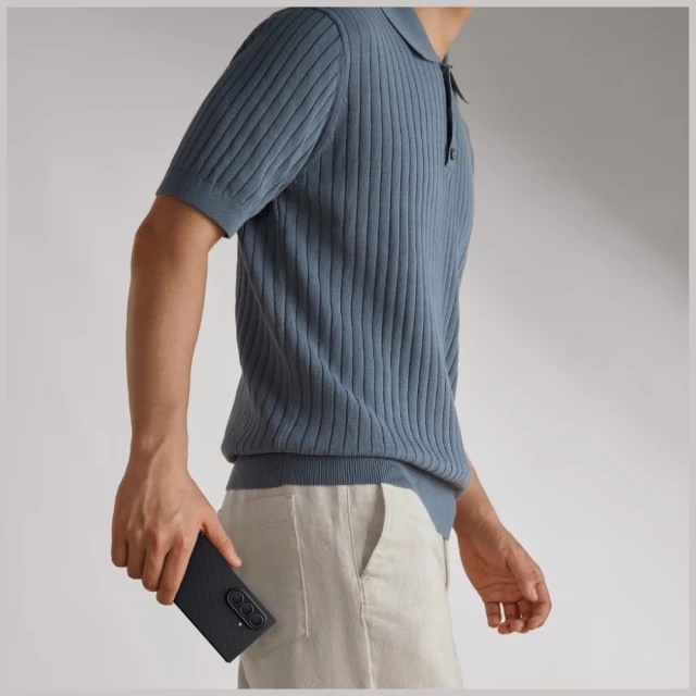 Изработен от карбон-арамид (aramid fiber), този калъф за Samsung Galaxy Z Fold 7 използва материал, познат от авиационната индустрия и висок клас защитни решения. Той е изключително лек, но същевременно устойчив на усукване и надраскване. Повърхността е обработена така, че да не задържа отпечатъци и да запазва чистия си вид при ежедневна употреба.