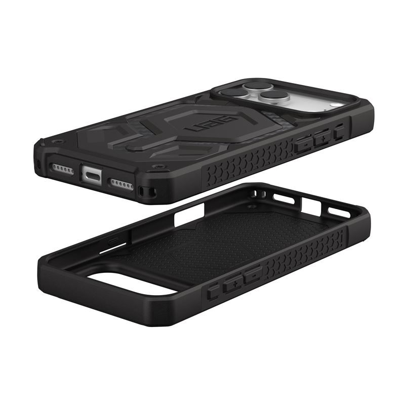 Черният карбонен завършек придава характерен, мъжествен и професионален външен вид, който ясно отличава UAG Monarch Pro кейсa за iPhone 17 Pro от стандартните защитни калъфи на пазара.