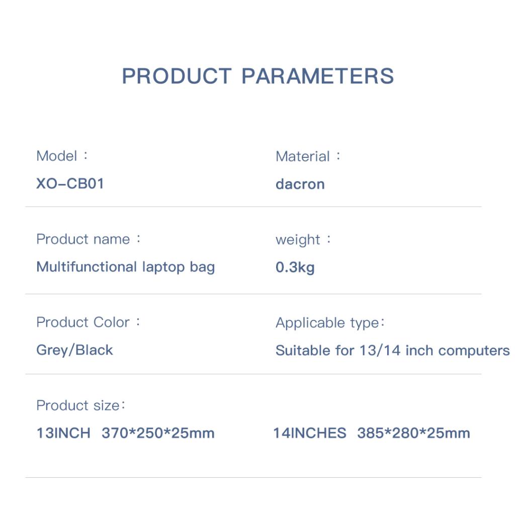 С тегло под 300 грама, XO чантата за лаптоп 14 инча е чудесен избор за хора, които пътуват често. Може да се използва самостоятелно или да бъде поставена в по-голяма раница или куфар. Леката конструкция и здравите дръжки осигуряват комфорт при носене, а материалът Дакрон е устойчив на влага и деформации.